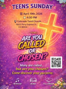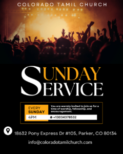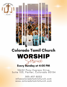We warmly invite you to join us at Colorado Tamil Church! Come experience a welcoming Tamil community where you can grow in faith, build meaningful relationships, and find support on your spiritual journey. Whether you’re seeking a place to belong or looking to deepen your relationship with God, we would love to have you with us!